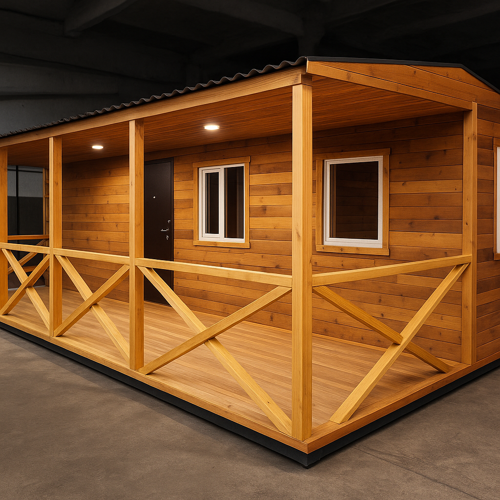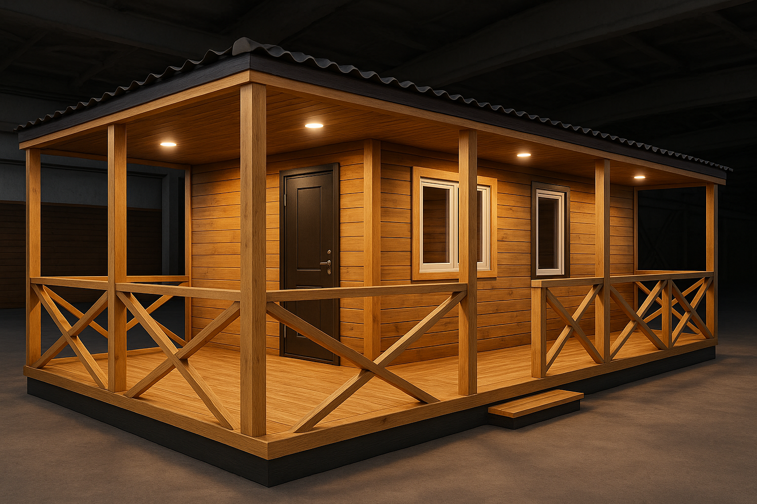 Теплий каркасний модуль з великою терасою під дахом — рішення для дачі, бази відпочинку чи гостьового будинку.